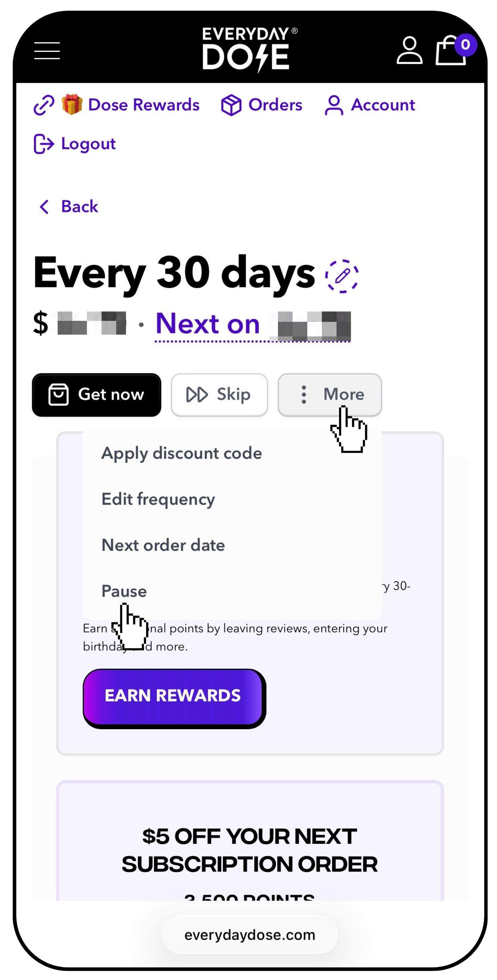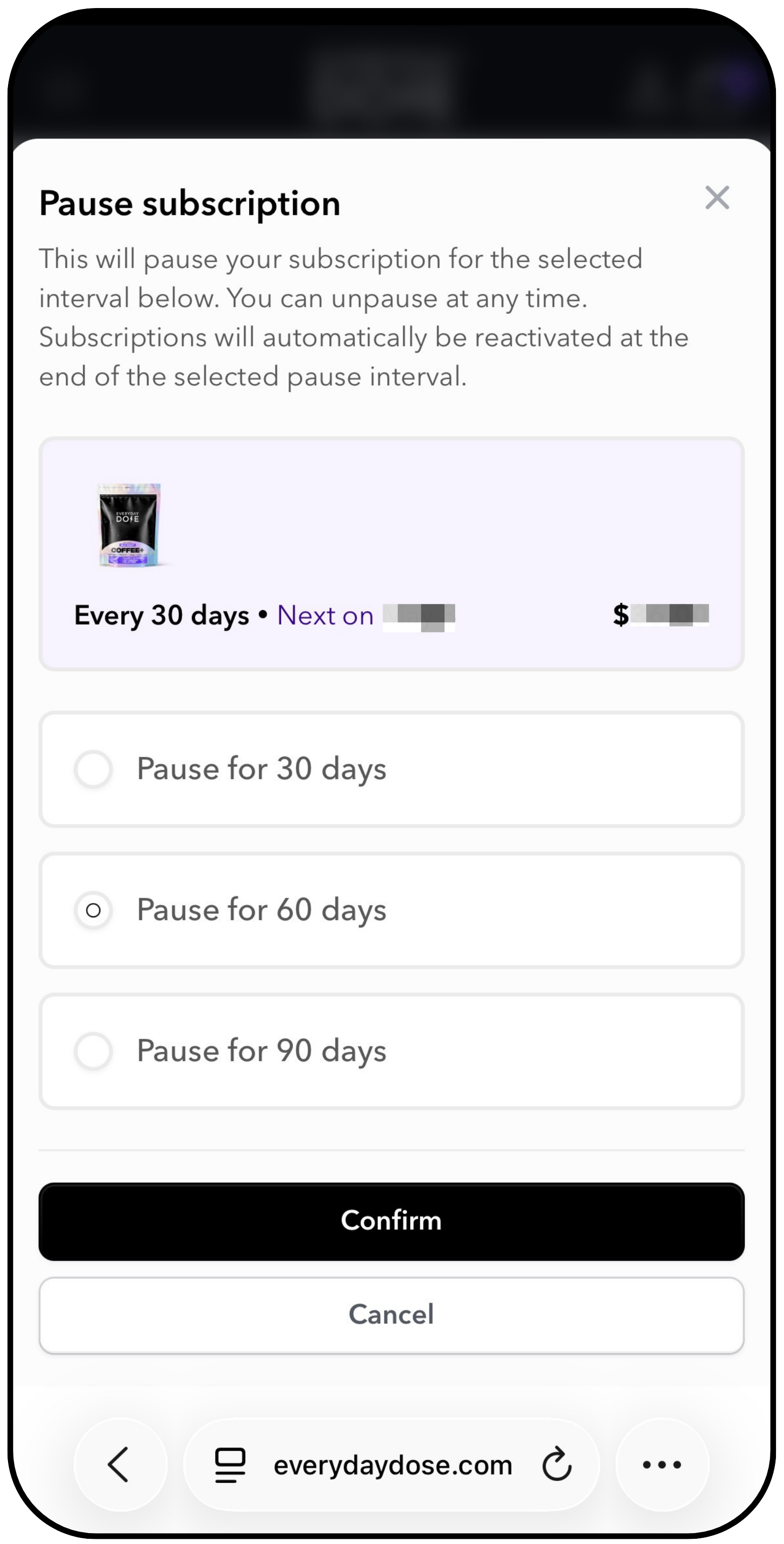 From there, you can choose to pause your subscription for 30, 60, or 90 days.