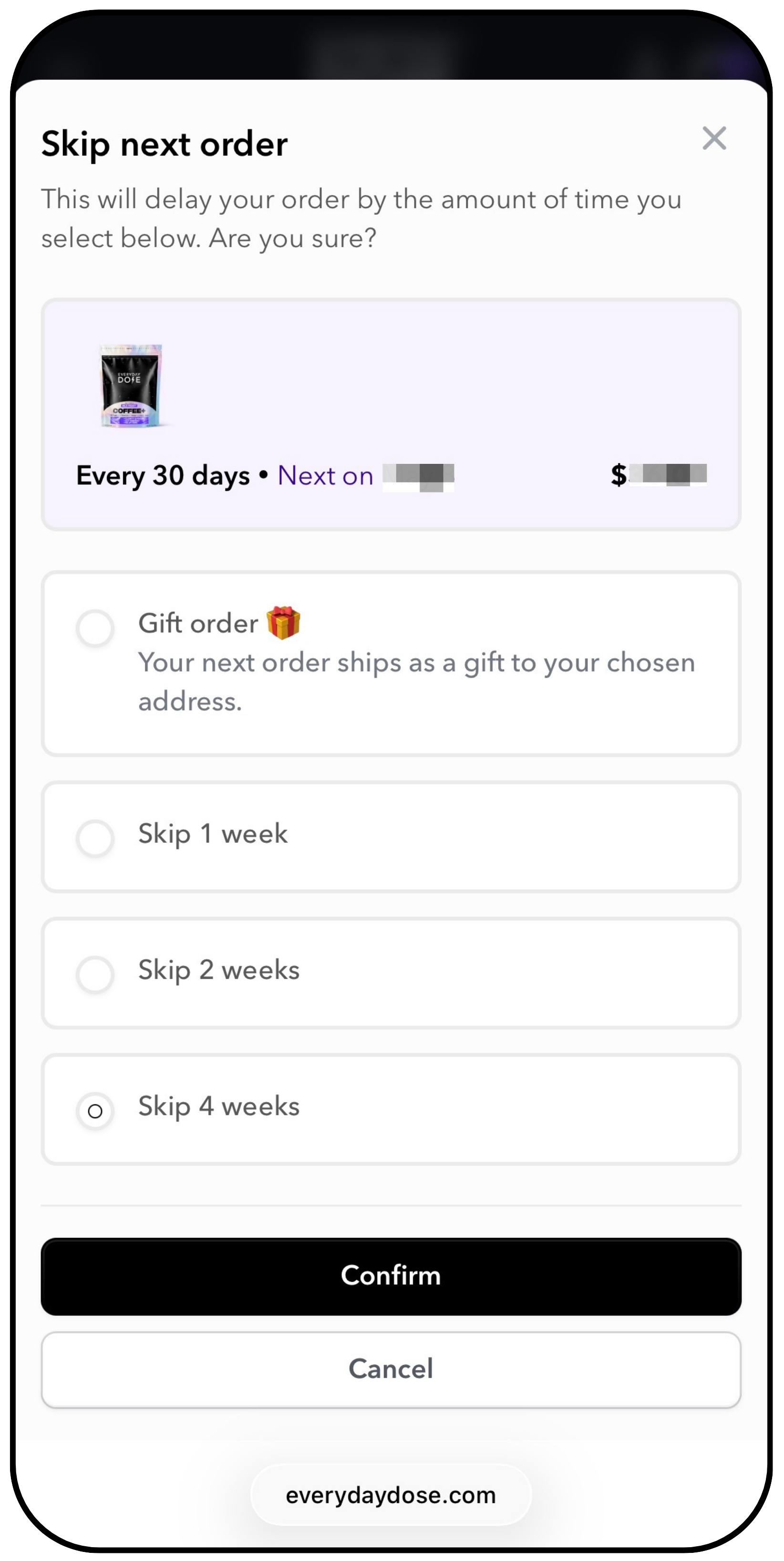 You’ll then be able to delay your next order by 1, 2, or 4 weeks.